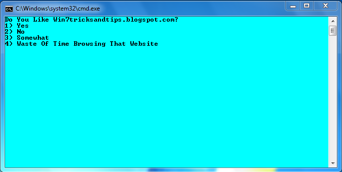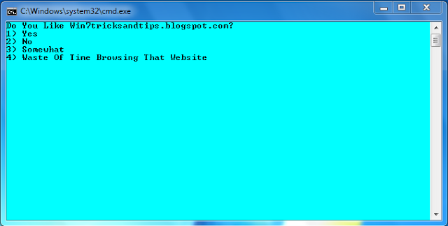 @echo off color b0 :menu cls echo Hey! Welcome to the game! echo 1) start! echo 2) how to play echo 3) Exit :,( set /p number= if %number% == 1 goto StartGame if %number% == 2 goto help if %number% == 3 goto exit :startgame cls echo Type Your Name: set /p name= echo Hello %name%! echo Do you want to start the quiz? (y/n) set /p start= if %start% == y goto level1 if %start% == n goto menu goto startgame :help cls echo Press the number of the answer then hit enter. echo go back? (y/n) set /p menugoto= if %menugoto% == y goto menu if %menugoto% == n goto exit goto help :exit goto exit :level1 cls echo Okay, Let's Start. echo What is 100 + 100? echo 1) 1 echo 2) 200 echo 3) 500 set /p answer1= if %answer1% == 1 goto wrong1 if %answer1% == 2 goto correct1 if %answer1% == 3 goto wrong1 goto level1 :correct1 echo You are right! Next Level? (y/n) set /p NL1= if %NL1% == y goto level2 if %NL1% == n goto menu goto correct1 :Wrong1 Echo Sadly, you were wrong. Retry? (y/n) set /p WA1= if %WA1% == y goto level1 if %WA1% == n goto menu goto wrong1 :level2 cls echo Who is on the 100 Rupee Note? echo 1) Mahtma Gandhi echo 2) Tommy King echo 3) Thomas Train echo 4) Jeff Dunham set /p aa= if %aa% == 1 goto correct2 if %aa% == 1 goto wrong2 if %aa% == 1 goto wrong2 if %aa% == 1 goto wrong2 goto level2 :correct2 echo You are right! Next Level? (y/n) set /p NL1= if %NL1% == y goto level3 if %NL1% == n goto menu goto correct1 :wrong2 cls echo YOU LOST! RETRY GAME? (y/n) set/p retry= if %retry% == y goto level1 if %retry% == n goto menu goto wrong2 :level3 cls echo Do You Like Win7tricksandtips.blogspot.com? echo 1) Yes echo 2) No echo 3) Somewhat echo 4) Waste Of Time Browsing That Website set /p aa= if %aa% == 1 goto correct3 if %aa% == 1 goto wrong3 if %aa% == 1 goto wrong3 if %aa% == 1 goto wrong3 goto level3 :correct3 cls echo YOU WIN THE GAME! goto correct3 :wrong2 cls echo YOU LOST! RETRY GAME? (y/n) set/p retry= if %retry% == y goto level1 if %retry% == n goto exit goto wrong3